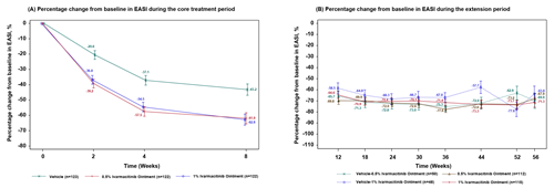 图4. 核心治疗期和扩展期EASI评分相对于基线的变化百分比